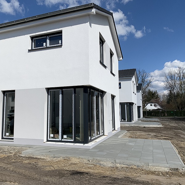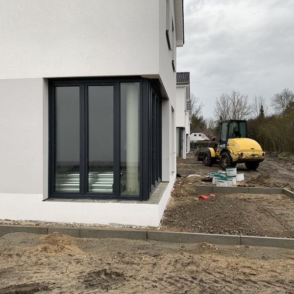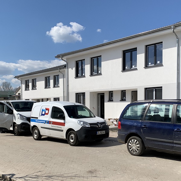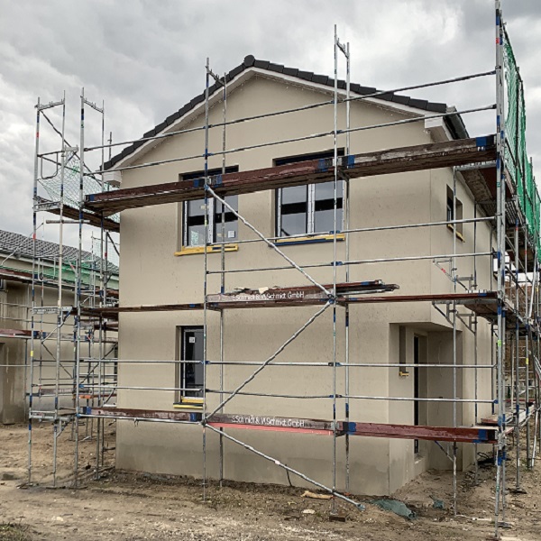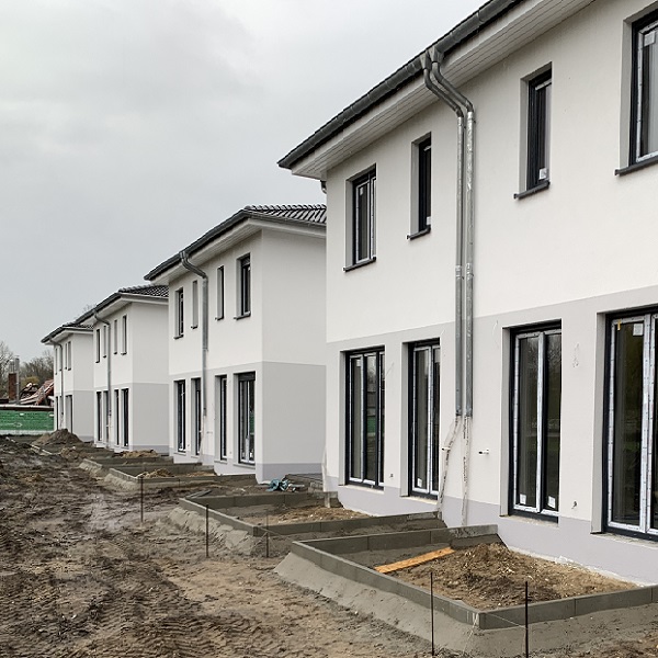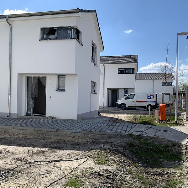 Auch von außen lässt sich die Fortsetzung der Bauarbeiten erkennen. Bei den letzten Häusern werden die Fassadenarbeiten fortgeführt. Zudem werden derzeit die Terrassen der Häuser gepflastert.